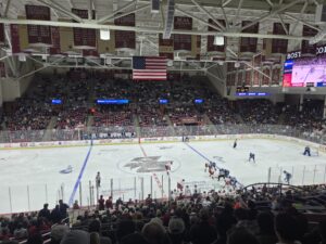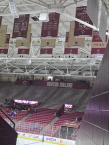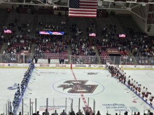 Meanwhile, Rousseau was doing his thing in between the pipes in his third collegiate start making two or three Grade A saves in the first period alone and many other stops to keep the momentum for his team throughout the evening. Maine did a much better job at limiting odd man rushes or having any defensive letdowns like it did in their 7-3 defeat on Friday night when junior Albin Boija was in net. And when they did, Rousseau was there to thwart those Eagles chances. Marques added some insurance with a rebound goal of a Sully Scholle shot at 8:53 of the third period. It was the first career two goal game for the freshman forward. Boston College would pull Cloutier with 3:20 left for an extra attacker, but Rousseau again was up for the challenge in notching the shutout. In his previous two starts, Rousseau had allowed four goals in a 4-0 road loss to Quinnipiac on October 18th and five in a wild 8-5 Black Bears home win over Boston University on November 1st. Earlier in the final period, Maine freshman forward Jeremy Langlois took a hit and lost his balance falling hard into the boards. Langlois was down for several minutes before being taken off the ice on a stretcher and didn’t return to the game. There is no word yet on any official injury status on Langlois, although head coach Ben Barr said postgame that he (Langlois) was moving and talking when being transferred off the playing surface.